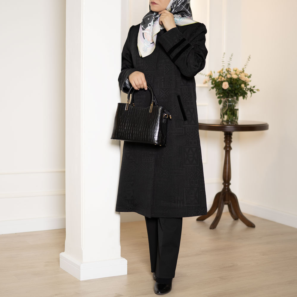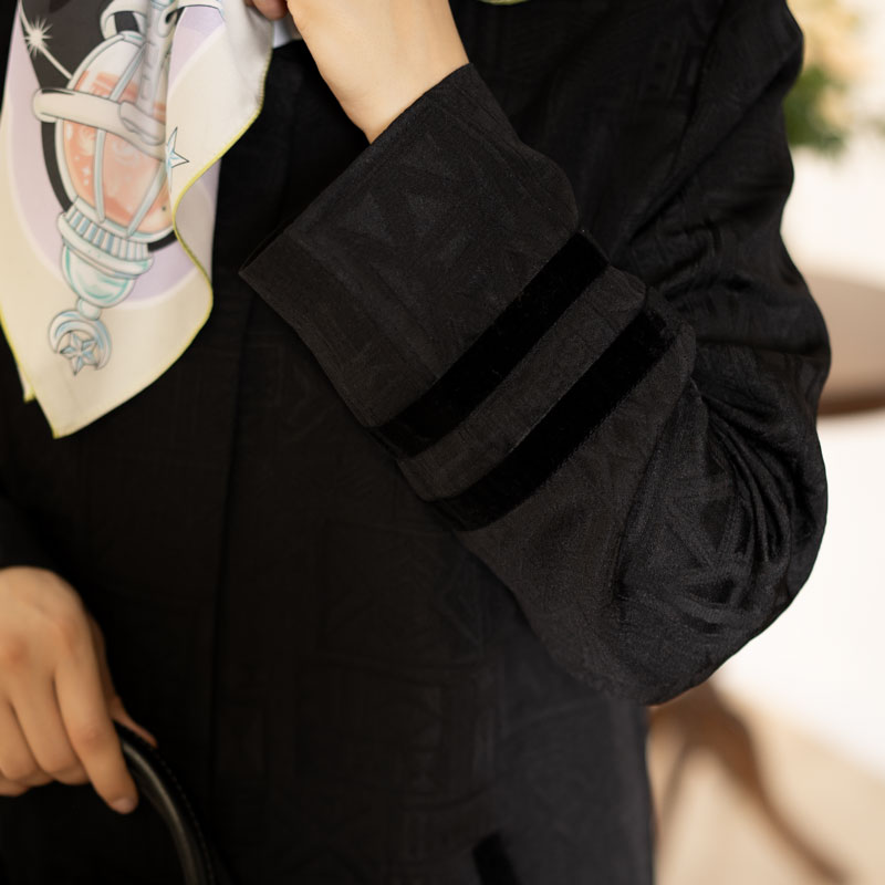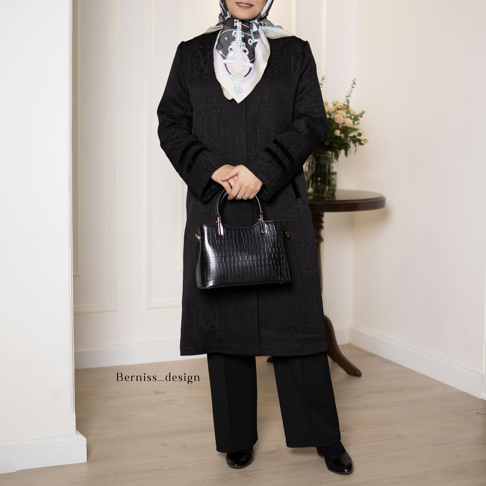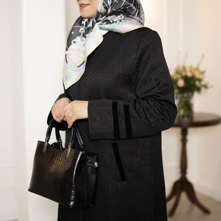 مناسب چهار فصل ـ جنس پارچه: ژاکارد ظریف، یقه گرد، نوارتزئینی ازجنس مخمل می باشد، این کار با شلوار گاباردین مشکی کدT115 ست شده است، ترجیحاً خشک شویی شود یا شستشوی دستی، اتوکشی یا بخار ملایم و بافاصله